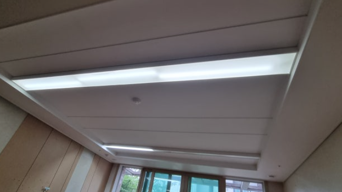 기존 천정 라인등은 변색과 조도 저하가 심한 상태였기 때문에 전체 철거 후 우물천정 재구성을 진행했습니다.
