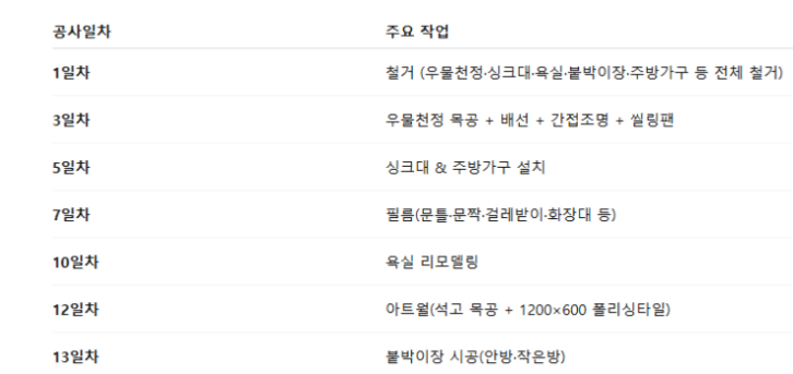 - 작업 범위 : 철거 / 우물천정 / 싱크대 / 아트월 / 필름 / 목공 / 도배 / 욕실 / 붙박이장 / 조명 등 전체 리모델링